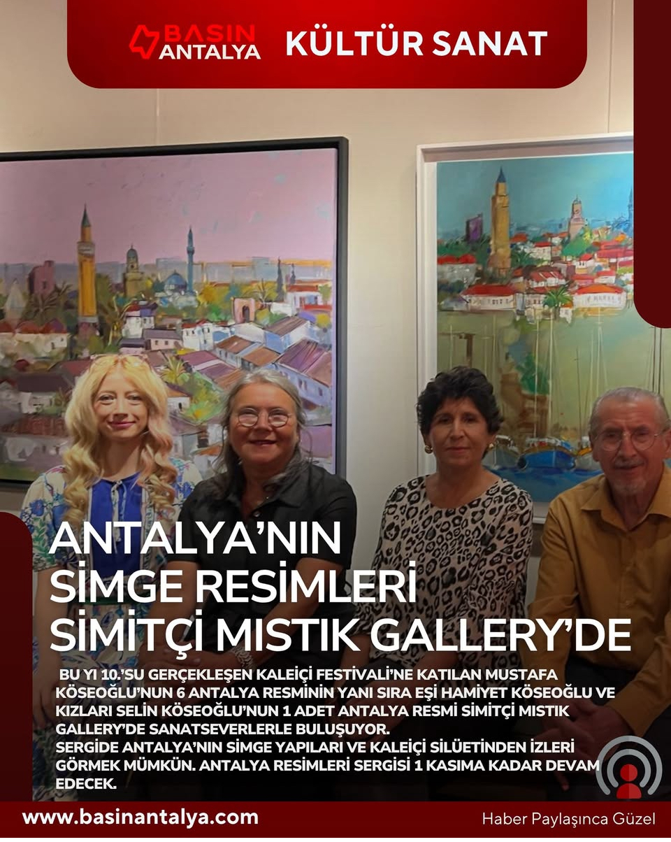 Simitçi Mıstık Gallery'de açılan “Antalya Resimleri Sergisi”nde, Mustafa Köseoğlu'nun Antalya temalı 6 tablosunun yanı sıra, eşi Hamiyet Köseoğlu ve kızları Selin Köseoğlu'nun da birer Antalya eseri yer alıyor.